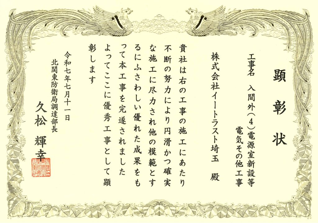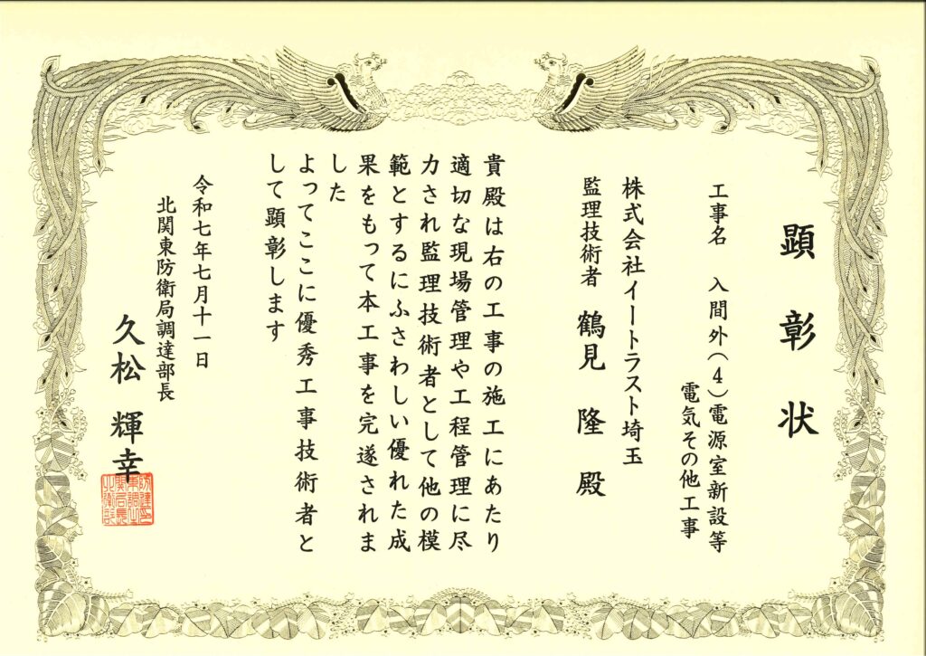 令和7年7月11日付けで、株式会社イートラスト埼玉は防衛省北関東防衛局より「入間外(4)電源室新設等電気その他工事」の施工において、優秀工事として顕彰されました。また、弊社監理技術者 鶴見 隆が優良工事技術者として顕彰されました。 このたびの顕彰は、現場管理・工程管理における高い技術力と、円滑かつ確実な施工への不断の努力が認められたものです。社員一同、大変光栄に感じております。