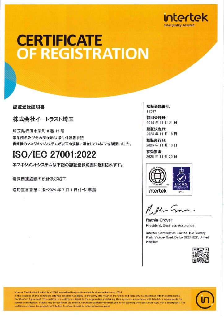 株式会社イートラスト埼玉は、『お客様からの信頼を基に、社会に必要な存在となり、その発展に寄与する』という経営理念のもとに、「社会から高い評価を得る設計及び工事を提供する」「地球にやさしい環境施策を実施する」「安全は総てに優先する」を三つの柱として、統合マネジメントシステムを構築し、下記を含む活動を推進します。